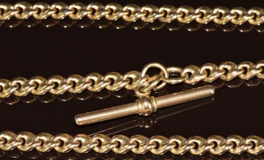 A yellow metal watch chain with T bar, 35.2g, 36cm