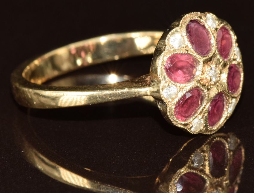 A 9ct gold ring set with six oval cut garnets and diamonds in a flower cluster, 3.5, size N
