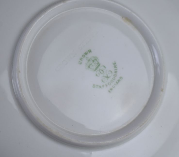 Cased George V hallmarked silver mounted Crown Staffordshire tea set comprising six tea cups and saucers, the silver mounts London 1915, maker William Comyns & Sons Ltd and named Bechtler Allahbad to undersides, the name also displayed within the silk lid. With Indian interest presentation plaque to outside of lid 'from Maharani Holkar to Miss Heriz Smith on her marriage, 20th Feb 1918', weight of silver mounts 300g