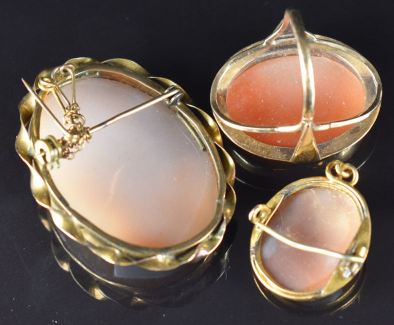 A 9ct gold ring set with a cameo depicting a young woman (size R, 7g), two 9ct gold Victorian brooches both set with cameos, silver christening bangle and a single ingot (37g)