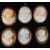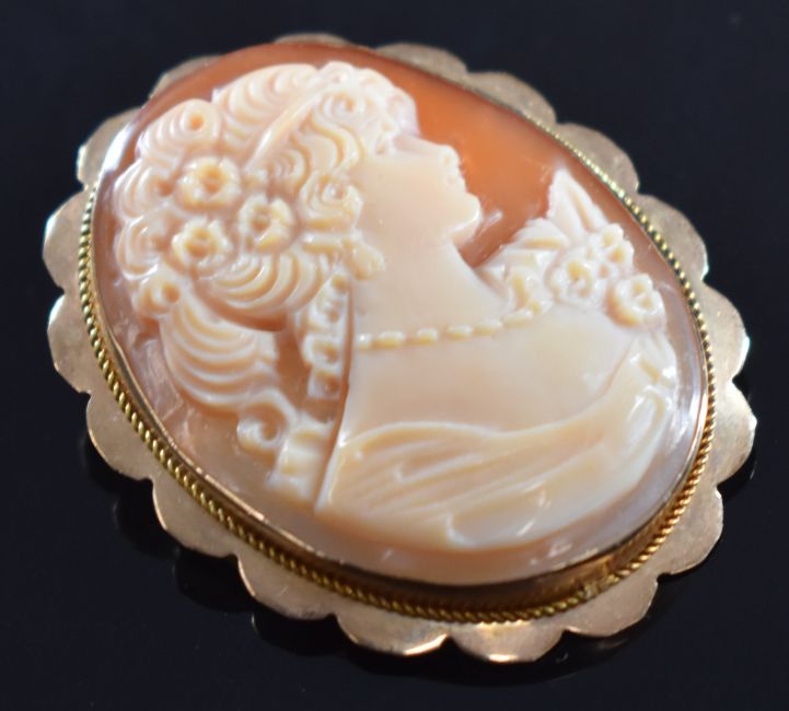 Six 9ct gold brooches set with cameos depicting young women (three with fold in pendant loops), largest 3.8 x 3.3cm, smallest 2.3 x 3cm
