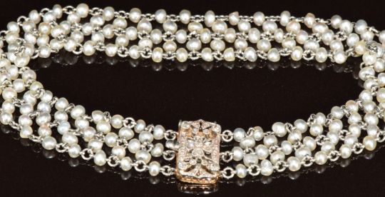 Belle Époque 9ct white gold bracelet set with natural pearls and with old and rose cut diamonds to the clasp, 10.8g, 18.5cm