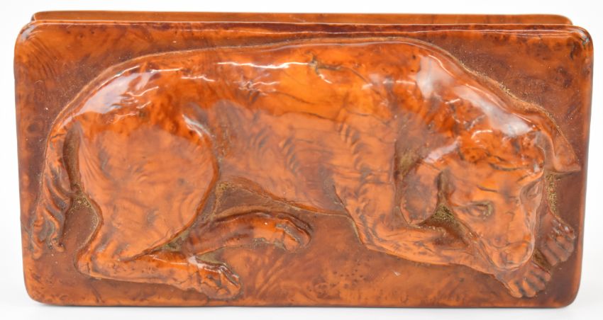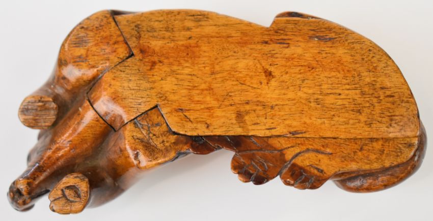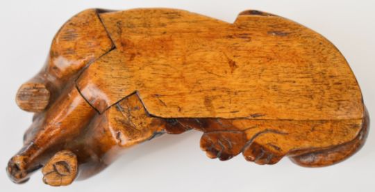 Carved wooden buckle in the form of a dog, two carved wooden treen boxes in the form of dogs and a pair of ceramic sea lions