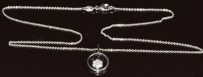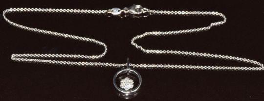An 18ct white gold pendant set with diamonds in a flower cluster by Leo Willwer (1.6cm) on matching 18ct white gold chain, 42cm, 4.8g
