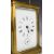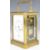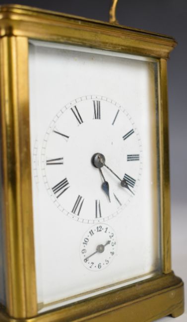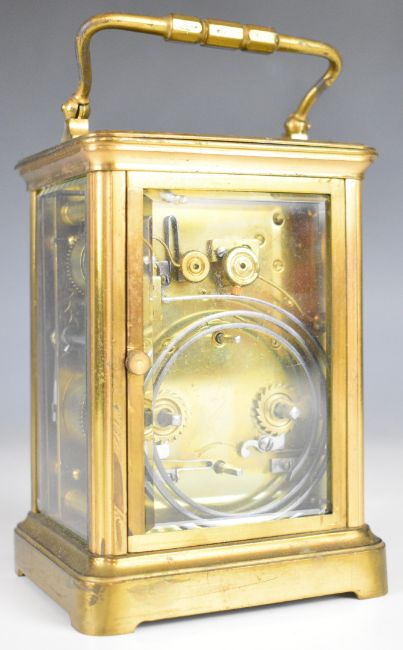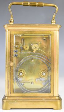19th or early 20th century gilt cased carriage clock with bevelled glass panels, the white enamel dial having alarm dial below, the three train movement striking on a gong, height including handle 18cm