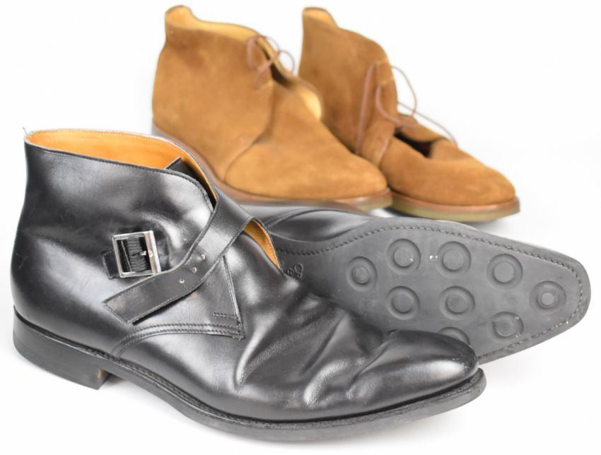 Two pairs of Bowen black leather gentleman's shoes, sizes 8 and 8.5, a pair of Peal & Co for Brooks Brothers suede lace up boots, size UK 9, and a pair of Crockett & Jones leather ankle boots, size 10