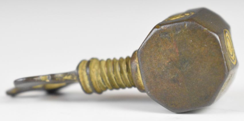 17th / 18thC or older brass or bronze nutcracker with engraved concentric circle decoration and heart shaped thumb piece on the screw mechanism, H5.5cm