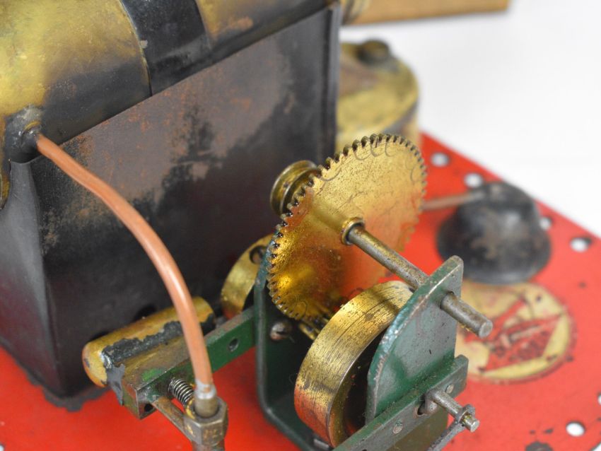 Bowman M140 live steam engine with twin oscillating cylinders and geared drive, all mounted on a red painted Meccano style metal base, in original wooden box
