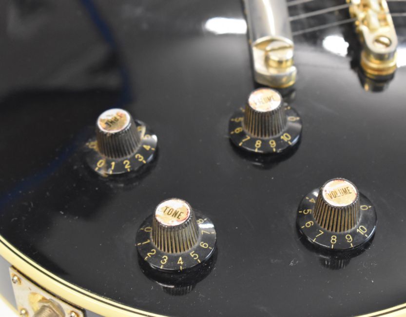 Les Paul 'Black Beauty' style electric guitar with rosewood fretboard, pearlescent inlays and humbucker pickups, likely Japanese lawsuit era.
