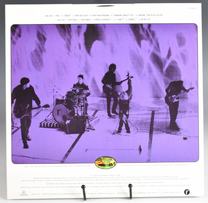 Radiohead Pablo Honey (PCS 7360) UK first press LP with white Parlophone labels, deadwax matrix PCS 7360 A-1-1-2 D COME TO FLORIDA and PCS 7360 B-02-01-2 D and purple picture cover inner sleeve. Vinyl would be Ex but for a non feelable scratch track 1 side A