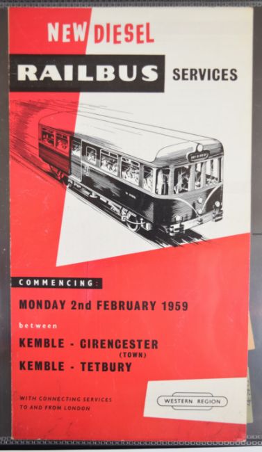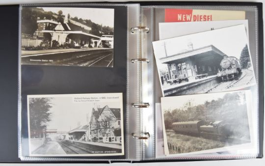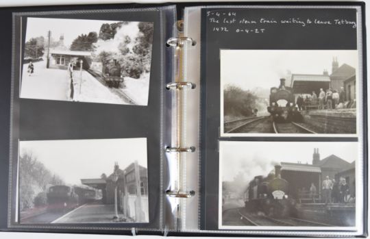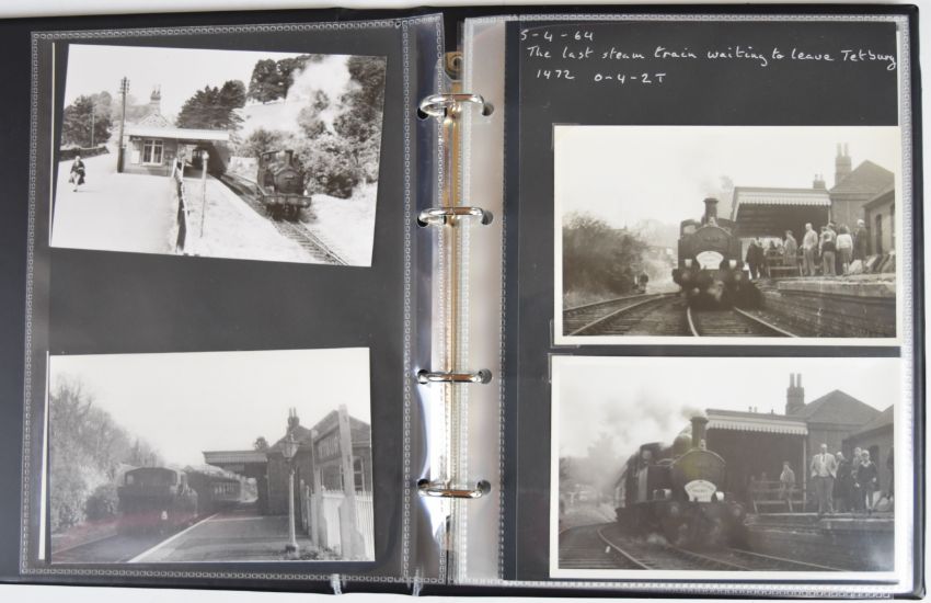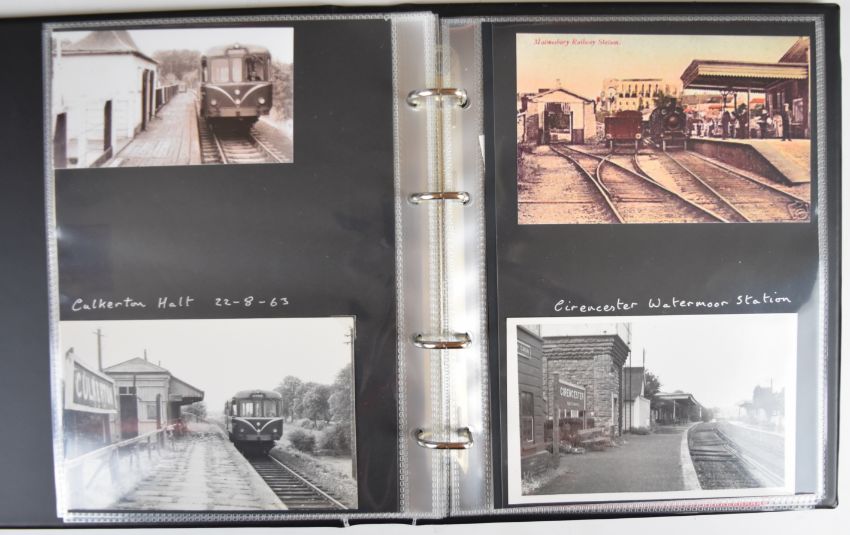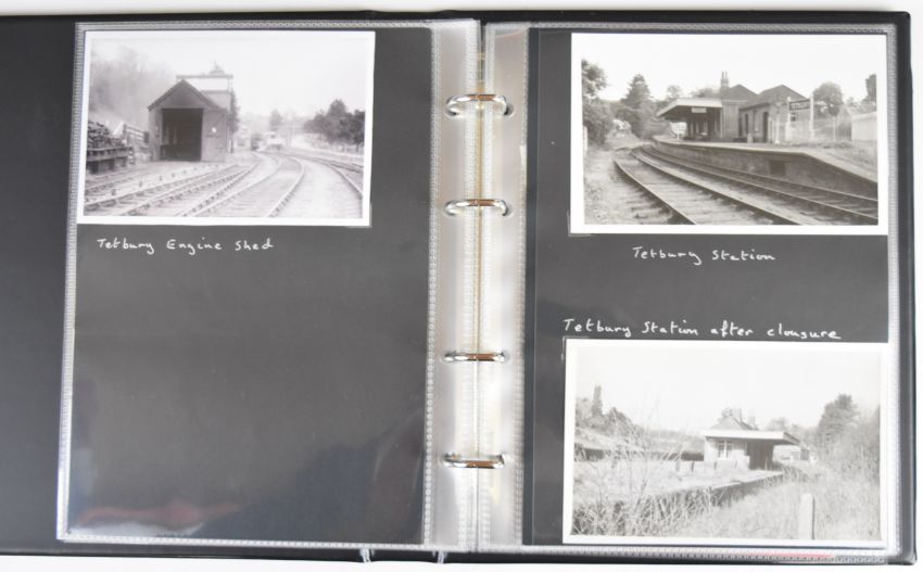 Collection of photographic prints with numerous scenes in and around Tetbury Station taken 1950s/60s including steam trains, Railcar and Railbus, goods shed and cattle dock, together with images of Kemble, Cirencester, Culkertan Halt, Malmsbury, Brimscombe and Midland Railway station and a printed flyer for the new diesel railway services from Kemble and several rail tickets one stamped HM Forces on Leave, housed in modern binder