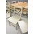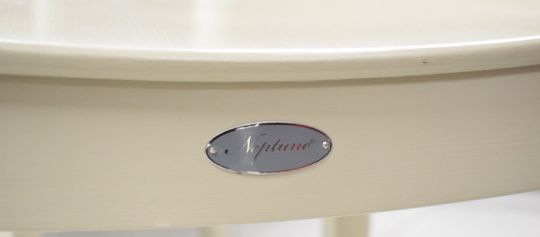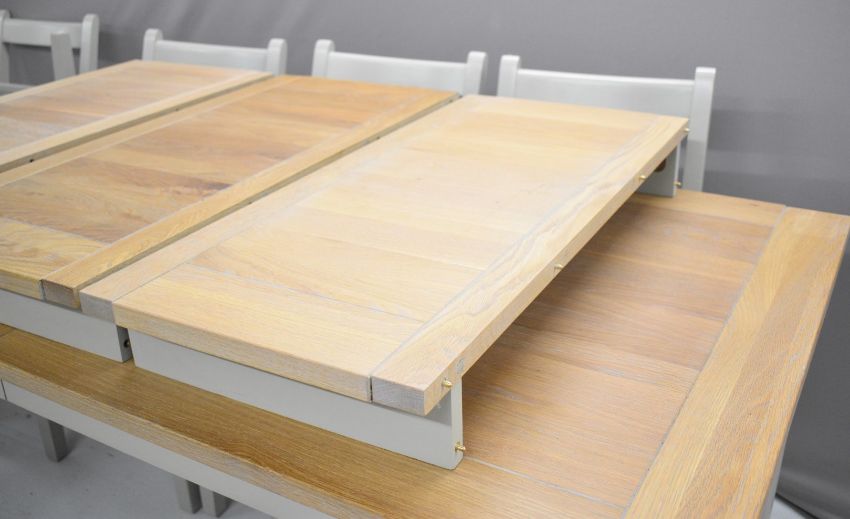 Modern Neptune extending oak topped dining table with painted green / grey base and 3 extra leaves, W180 (300max) x D90 x H77cm, together with set of 10 painted chairs with tapered legs