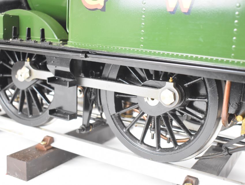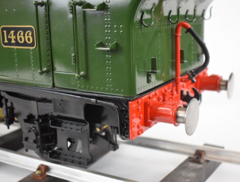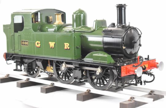 Silver Crest kit built 5 inch gauge GWR 14xx 0-4-2 tank locomotive, the silver soldered coal fired copper boiler having 0-150psi pressure gauge, water level gauge glass, whistle under the cab floor and single safety valve, fed by a hand pump in the left hand tank and axle driven pump, the twin inside cylinders having Stephenson's link reversing gear controlled from a screw reverser in the cab, the buffers, coupling hooks and all axles being sprung, with paperwork including boiler hydraulic test certificate dated 2016, on a length of display track. Overall length of locomotive 81cm