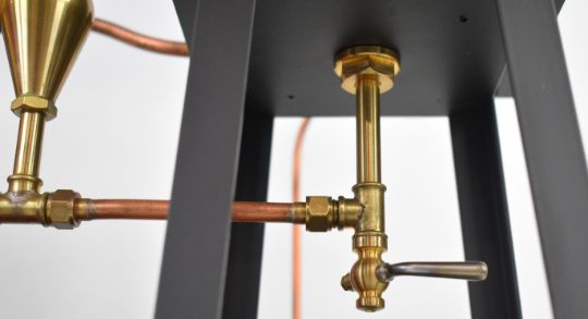 Exhibition quality model of a Rider Ericsson hot air or Stirling cycle engine, driving a brass pump and spoked 22.5cm flywheel, with ceramic gas burner within a cast firebox with chimney finished by a turned copper cap, the wooden base also supporting a water tank. Overall length of base 50.5cm