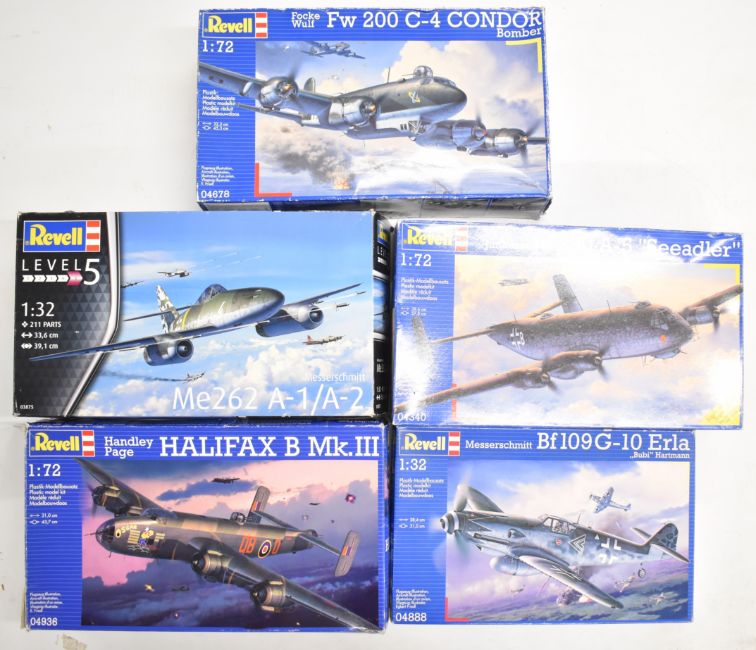 Five Revell 1:72 and 1:32 scale plastic model aeroplane kits comprising Messerschmitt Bf109 G-10 Erla 04888, Handley Page Halifax B Mk III 04936, Focke Wulf Fw C-4 Condor Bomber 04678,  Junkers Ju 290 A-5 Seadler 04340 and Messerschmitt Me262 A-1/A-2 03875, all in original boxes with instructions, decals etc.