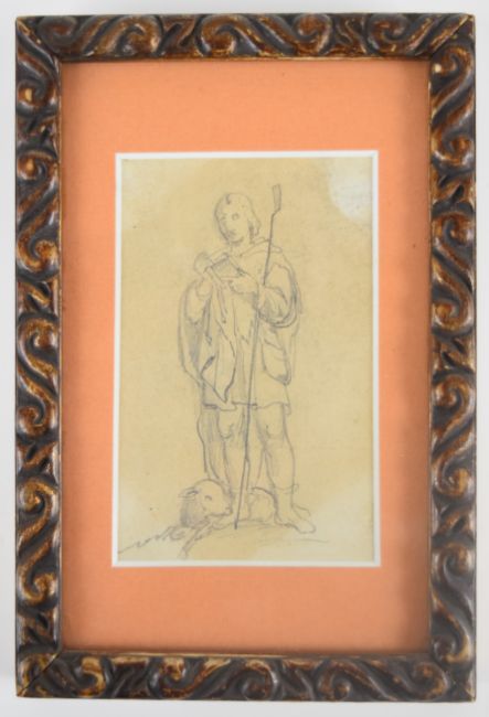 Attributed to Dominik Weber (1819-1887) pencil sketch of a shepherd reading from a book with sheep at his feet, 9.5 x 6cm, in embossed gilt frame with faint details verso