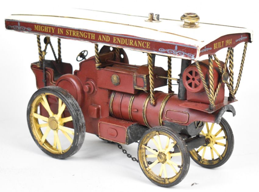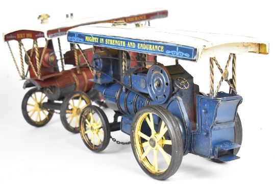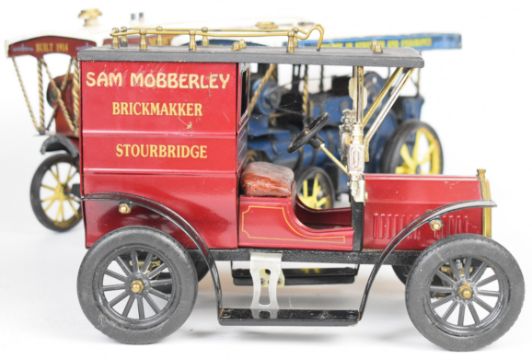 Four tinplate and similar models comprising two showman's steam traction engines, Adler steam locomotive and an early van, length of longest 31cm