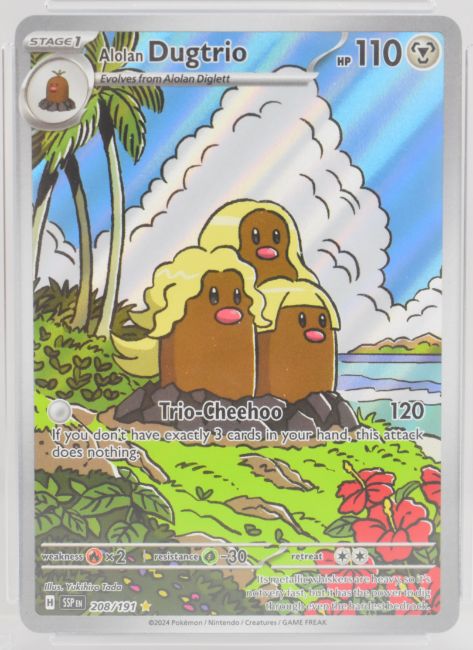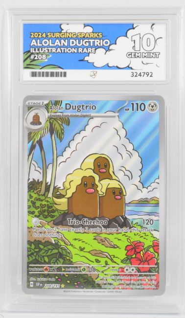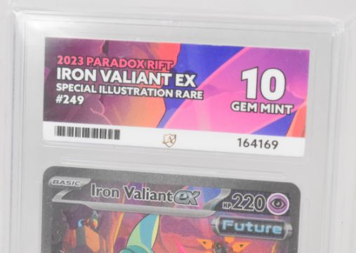 Four graded Pokémon cards comprising Iron Valiant EX 249/182, Chansey JPN 113/101, Alolan Dugtrio 208/191 and Pidgey 118/108, all 10 GEM MT, Ace and PG Grading.
