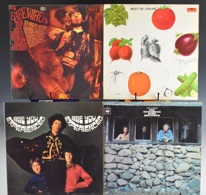 Collection of fourteen mainly 1960's first pressing LPs. Psychedelic Rock / Rock / Folk etc, including rarities comprising Spooky Tooth Spooky Two (ILPS 9098) with pink Island 'Eye' design label with rough label finish and Ernest J Day sleeve; The Beatles White Album (PCS 7067) early pressing numbered 0324757 with top opening embossed 'Beatles' cover, black inner sleeves and poster present but has been taped; Cream Fresh Cream (Reaction 593001) mono, Bee Gees 1st (Polydor 583 020), The Byrds The Notorious Byrd Brothers (CBS 63169) with orange label, Jimi Hendrix Are You Experienced (Track 612001) with Ernest J Day sleeve, John Mayall Bare Wires (SKL 4945) with unboxed blue Decca label, Best of Cream, Byrds Greatest Hits, The Rolling Stones Aftermath (LK 4786) with unboxed red Decca label, two Travelling Wilburys, The Association Insight Out (London American HA-T8342) mono, Pentangle History Book. Vinyl appears VG+ in the main