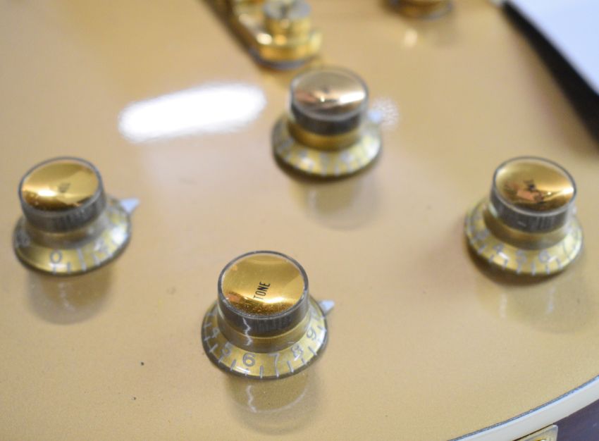 Grant Les Paul style electric guitar in Gold Top finish with rosewood fretboard, pearlescent inlays and humbucker pickup, made in Japan, likely early 1980's manufacturing, in fitted carry case.