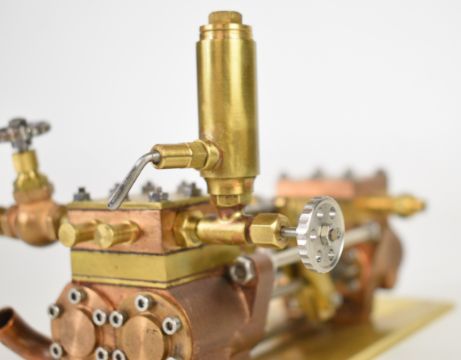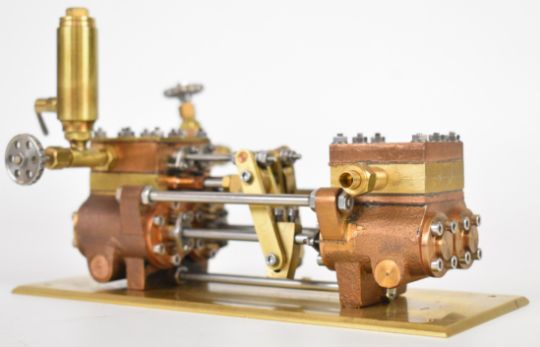 Southworth live steam model twin cylinder duplex boiler water feed pump with displacement lubricator and throttle valve, on a brass base, overall length 18cm