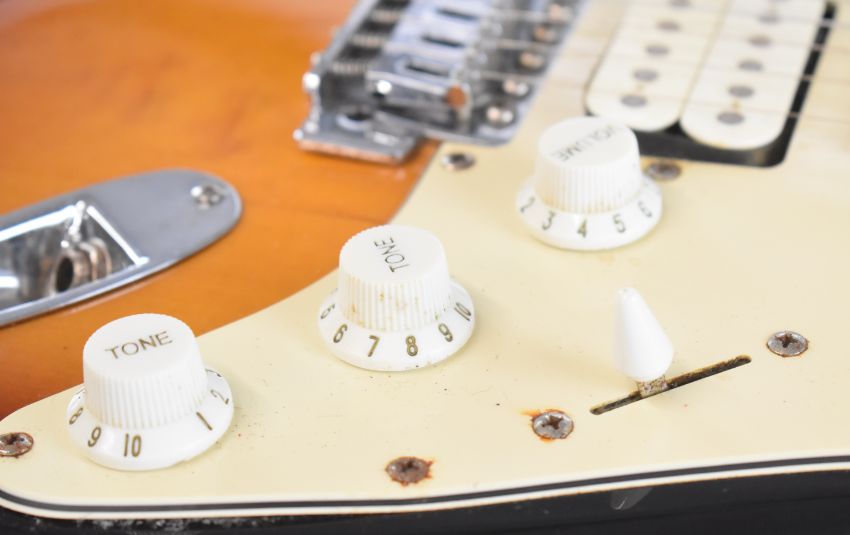 Fender Stratocaster style electric guitar in tobacco sunburst finish with maple neck, pearlescent inlays and humbucker pickups, likely a copy but with a level of quality and ageing, in fitted Fender case.