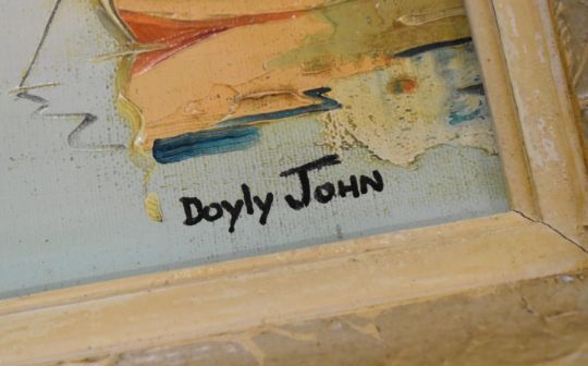 Cecil Rochfort D'Oyly John (1906-1993) oil on canvas 'Alassio' Italian coastal town or seascape with boats beside buildings and sea beyond, signed lower right and titled verso, 44 x 64cm, in in distressed frame with The Little Gallery Worthing label verso