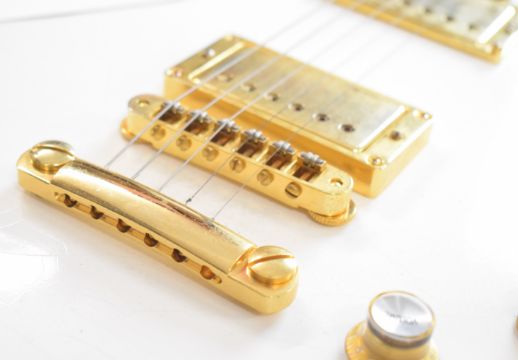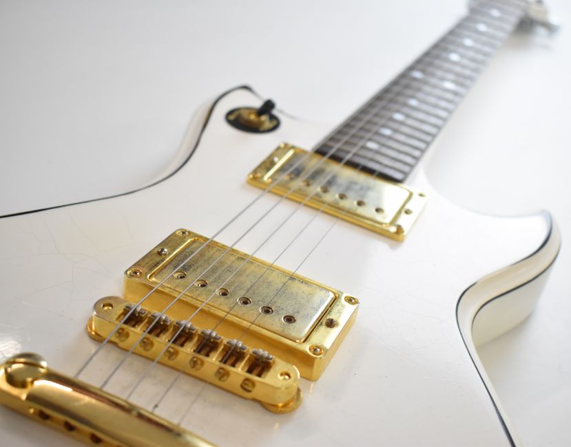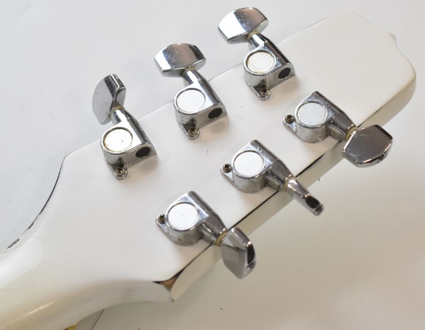 Japanese made electric guitar, likely lawsuit era 1970's in white finish with rosewood fretboard, pearlescent inlays and humbucker pickups, similar styling to a Yamaha SG-1000, in fitted carry case.