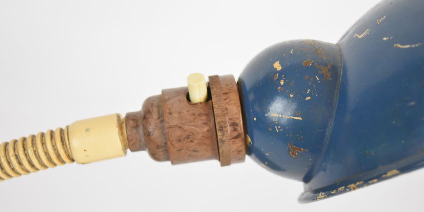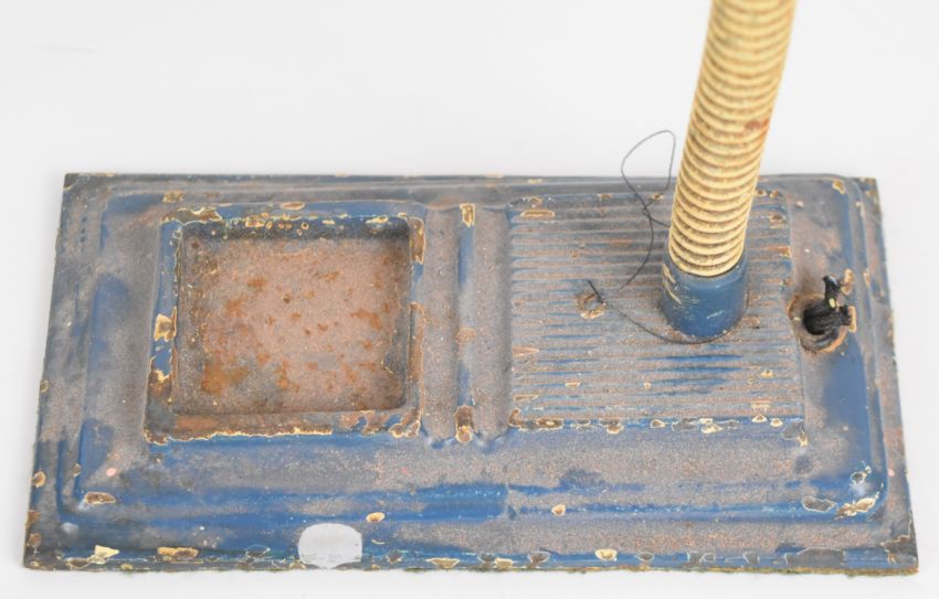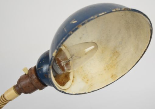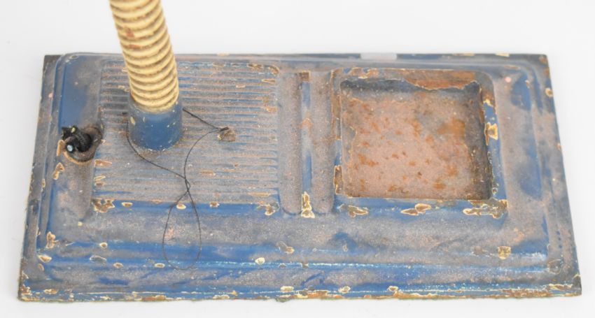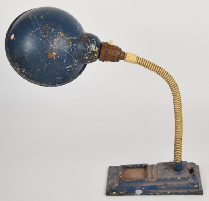 Industrial desk lamp with parts tray to base, approximate height 40cm