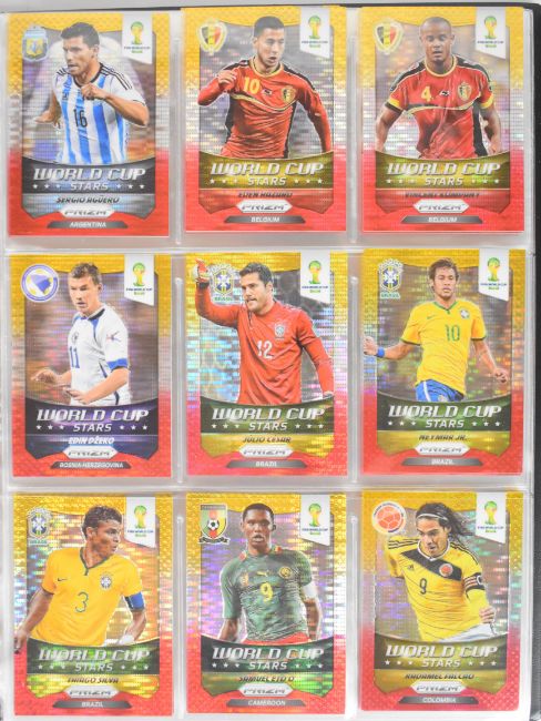 Panini Prizm 2014 World Cup football trading card set appearing complete, yellow red pulsar variant, comprising Base, Guardians, Netfinders, Aerial Assault, Matchups, World Cup Stars etc, to include Lionel Messi, Pele, Cristiano Ronaldo, Wayne Rooney, Steven Gerrard, Didier Drogba, Neymar Jr, Jurgen Klinsmann, Roberto Baggio, Cafu, Marouane Fellaini and Eusebio. Total card count 411.