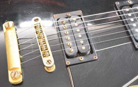 Greco Les Paul 'Black Beauty' style electric guitar in black gloss finish with cream trim, pearlescent inlays and humbucker pickups, made in Japan.