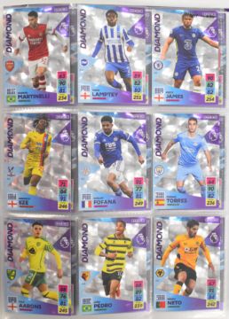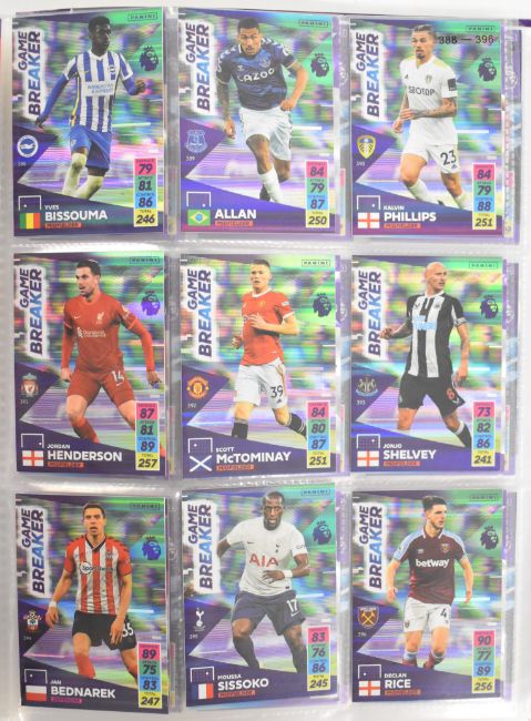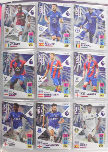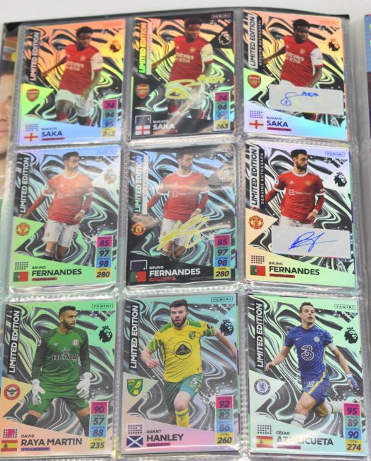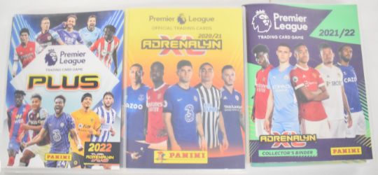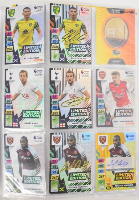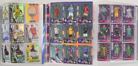 Panini Adrenalyn XL Premier League 2020/21 and 2021/2022 football trading card sets comprising complete or near complete base sets together with multiple subsets, limited editions and a signed/autographed Michail Antonio, contained in three official folders.