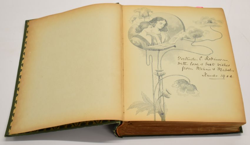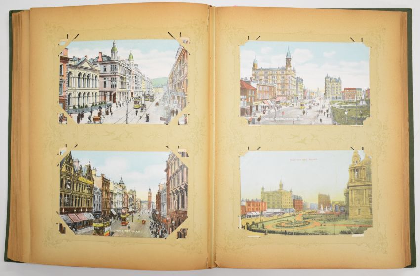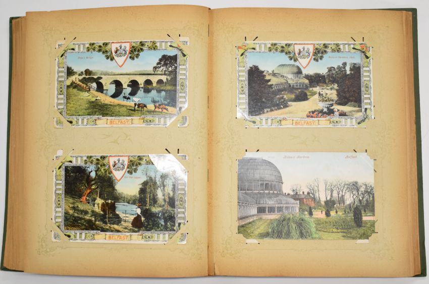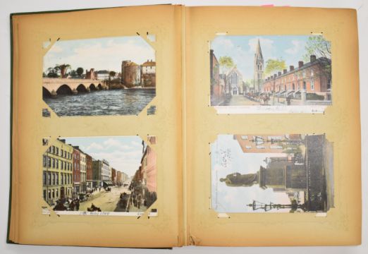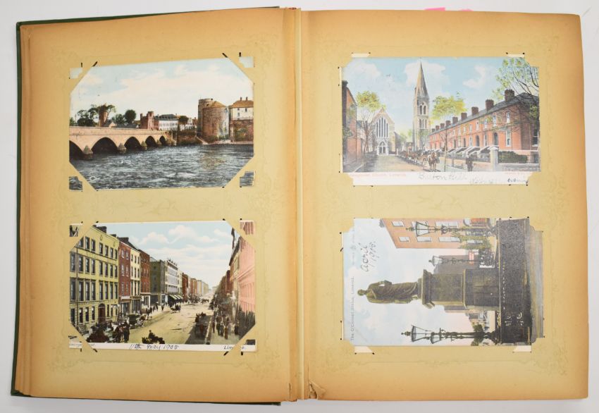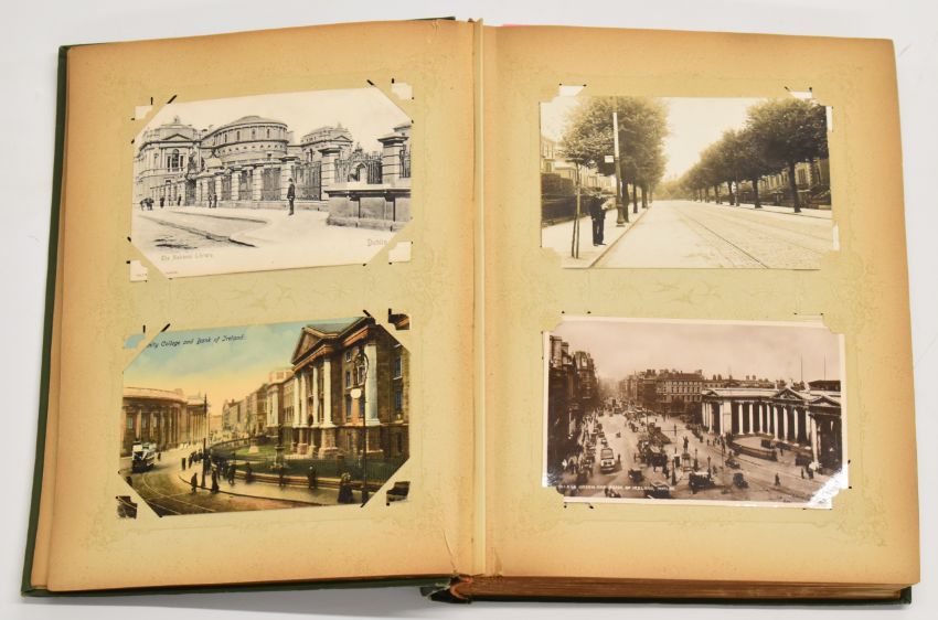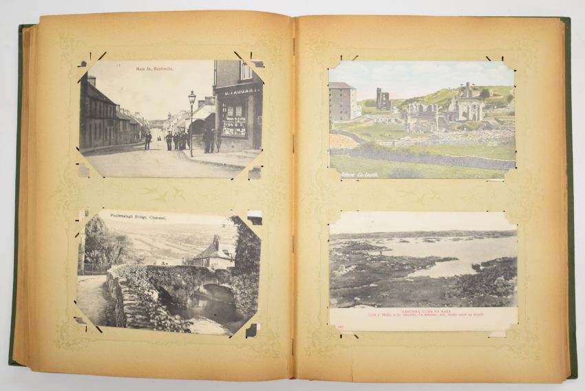 Over 150 Edwardian postcards with street scenes of social history, topographical and coastal views and landmarks from Ireland to include Galway, Co. Waterford, Moville, Dublin, Limerick, Co. Clare, Co. Antrim, Cork, Belfast, Londonderry, Wicklow, Giant’s Causeway, Kingstown, Tullamore, Donaghadee. Nenagh, Bushmills etc, housed in a colour decorated and illustrated Art Nouveau album with gilt title and 1902 inscription