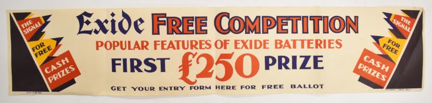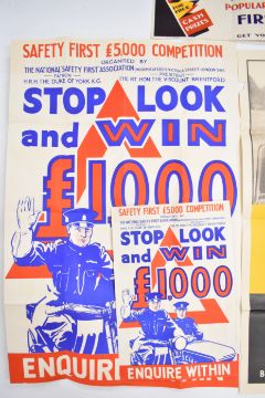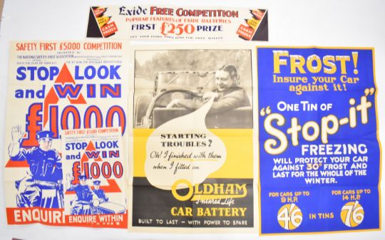 Five circa 1920s vintage car and similar posters comprising Oldhams batteries, "Stop-it" frost prevention, Exide batteries and Safety First, largest 75 x 50cm