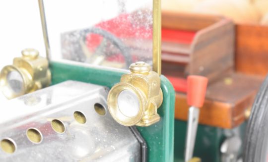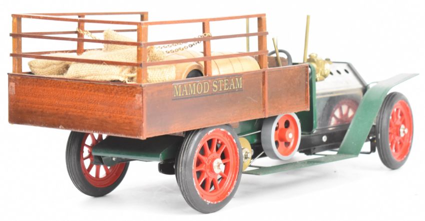 Mamod live steam car or pickup truck with reversing single oscillating cylinder, the scratch built wooden box holding a load of wooden barrels and canvas sacks, length 40cm