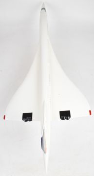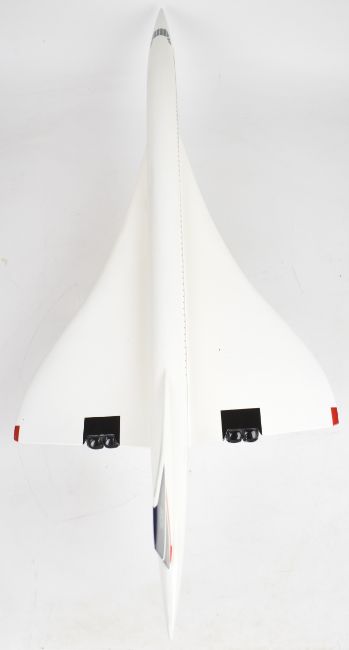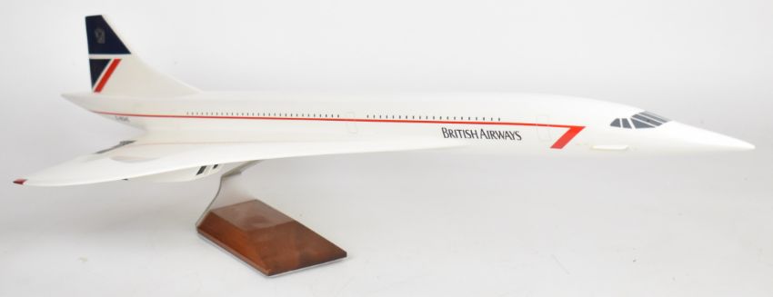 Fibreglass or similar British Airways Concorde painted model aeroplane, G-BOAC, on metal and wooden stand, length 85cm.