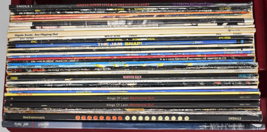 Thirty six Indie Rock / Punk / Post Punk / New Wave etc LPs, including Pearl Jam Gigatron and Back Spacer (die cut sleeve), The Cure The Head On The Door, Skunk Anansie Stoosh, Temple of the Dog (bootleg) Lo and Behold, three Talking Heads, two copies of Kings of Leon Mechanical Blue, Prince, Royal Blood, Flamin' Groovies, Siouxsie and the Banshees, Shakespears Sister, Gigolo Aunts, Two Men at Work, The Jam, two Stranglers, Lloyd Cole and the Commotions, Go West, Bill Nelson, Blondie, Hazel O'Connor, The Police, Toyah, Simple Minds, two Mink De Ville, The Pretenders, Deacon Blue, Vinyl appears VG+ to Ex+ in the main