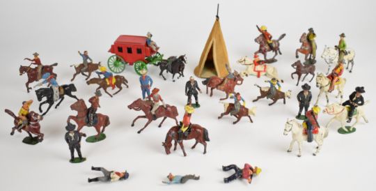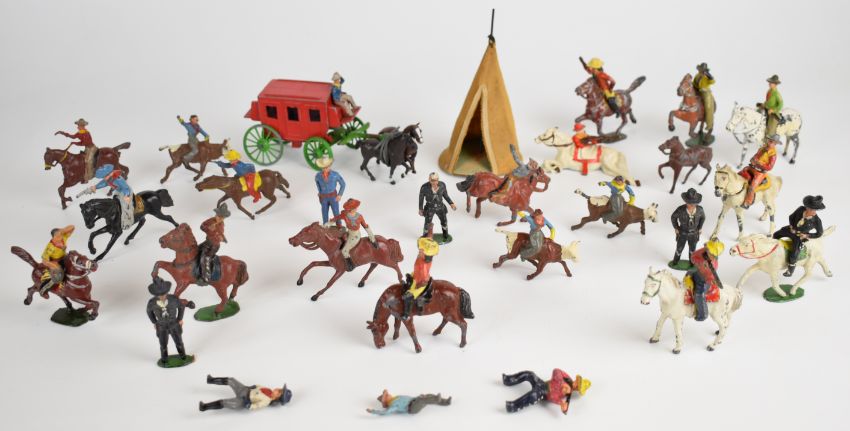 Twenty-eight Timpo and J Hill & Co painted metal cowboys and Indians to include mounted examples, stagecoach, rodeo riders, Buffalo Bill and Hopalong Cassidy.