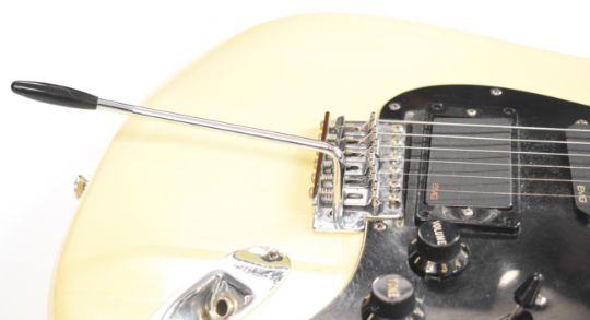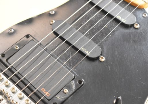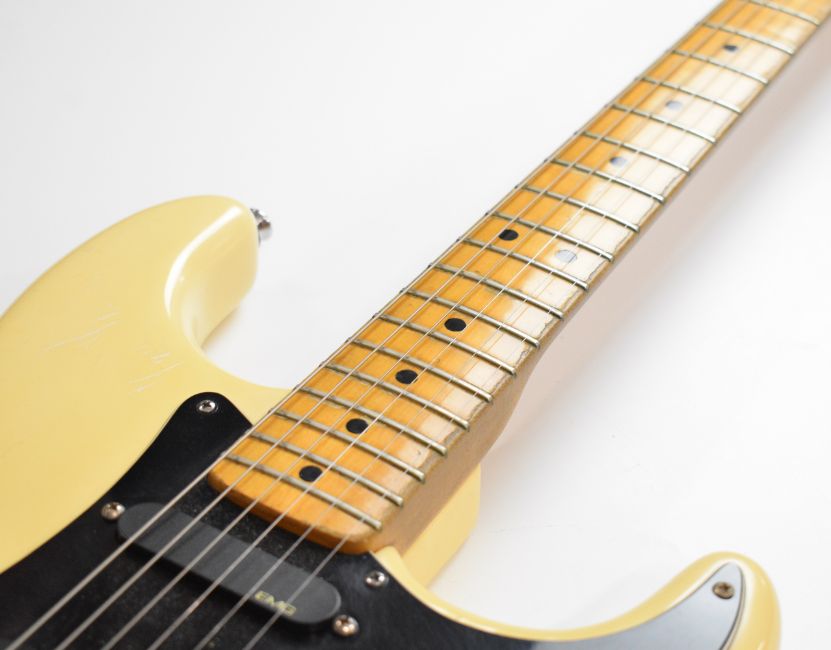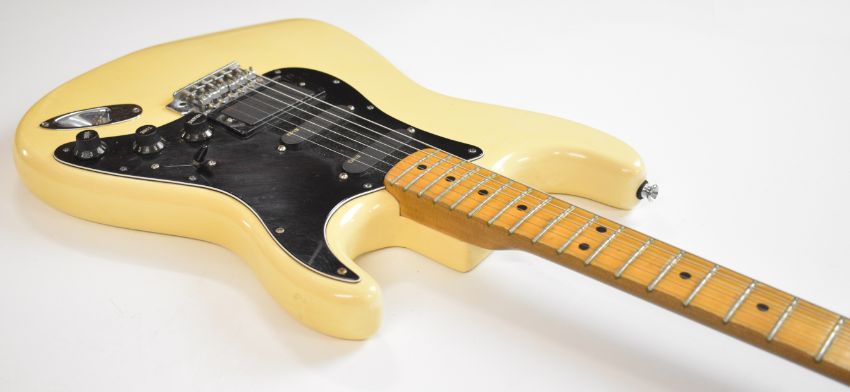 Fender Stratocaster electric guitar in cream finish with maple neck and black scratch plate, customised to fit an EMG humbucker pickup, made in USA, 1974, serial no. 481022, in fitted Fender case.