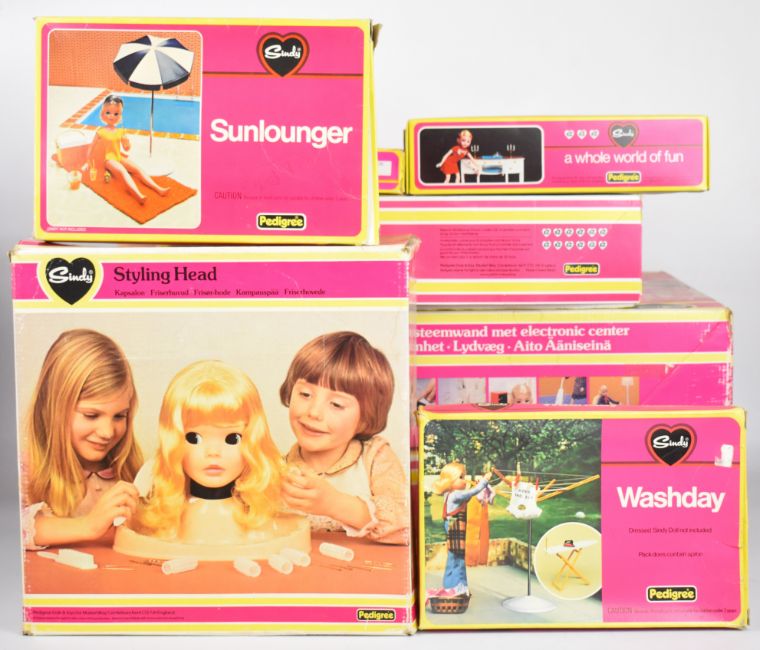 Twelve Pedigree Sindy playsets and accessories to include Electronic Wall of Sound, Camping Scene, Bathroom Gift Set, Swimming Pool and Styling Head, all in original boxes.