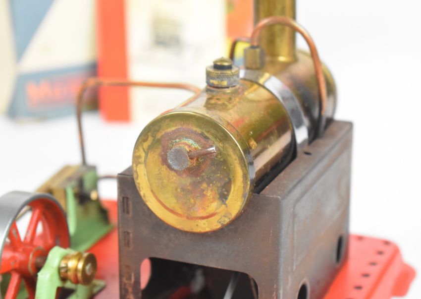 Mamod SE1 live steam engine, on Meccano style base with single oscillating cylinder, in Mamod SE1 box