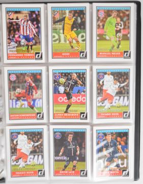 Panini Donruss 2015 football trading cards comprising complete base set and a large collection of chase cards including 'Press Proof' Cristiano Ronaldo, Lionel Messi, Luis Suarez, David Luiz, Gerard Pique, Fernando Torres cards and 57 'The Beautiful Game' single and multiple signature cards including Pepe, Robinho, Ramires, Willian, Didier Drogba, Xabi Alonso, Sergio Ramos, Marquane Fellaini, Giuseppe Rossi, Joe Hart, Jordan Henderson, Luke Shaw, Wesley Sneijder, Javier Mascherano and Maxi Pereira, total card count 434.