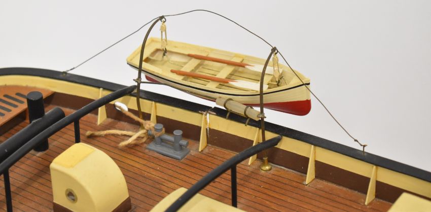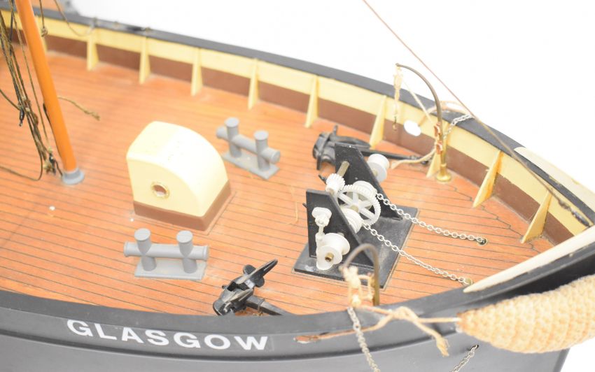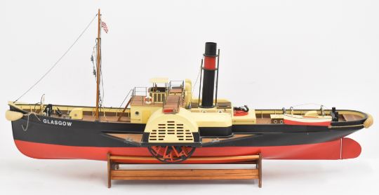 Graupner Glasgow model paddle tug boat with moulded plastic hull and detailed deck house, windlass and mast, having radio control geared electric motor and rudder, the paddle wheels being of feathering design, overall length 102cm