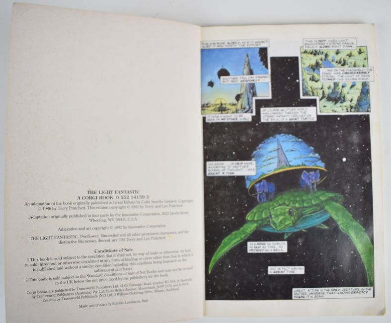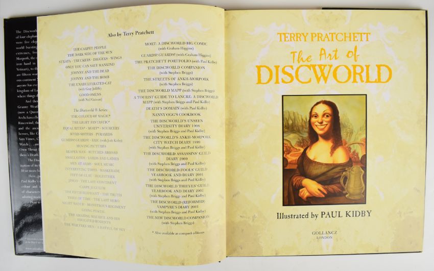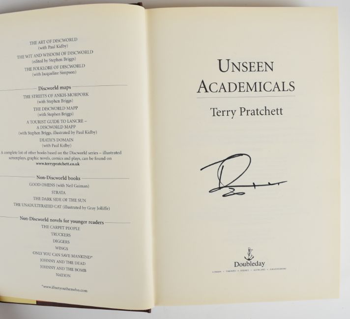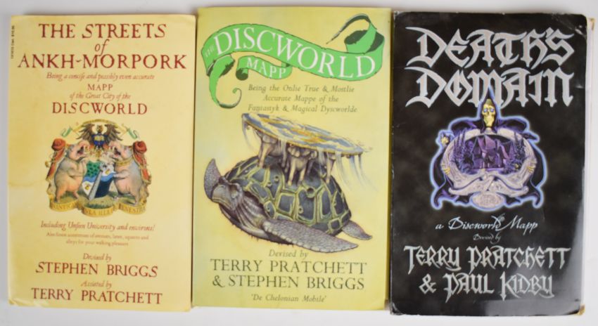 Terry Pratchett collection of novels, maps and comic books including three signed copies The Last Hero, Unseen Academicals and A Hat Full of Sky with other novels including Mort, Men At Arms, The Colour of Magic, Moving Pictures, Nanny Ogg’s Cookbook, Going Postal, Johnny Maxwell Trilogy and Discworld Mapps of Lancre, Streets of Ankh-Morpork, Death’s Domain and Dyscworlde, a copy of The Unseen University Cut-Out Book, The Art of Discworld etc, mostly hardback in dust wrappers and including some first editions (33)