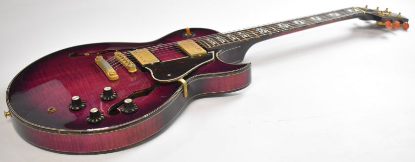 Greco RS-1000 semi acoustic electric guitar in purple/black burst finish with rosewood fretboard, pearlescent inlays, tortoiseshell style trim and humbucker pickups, made in Japan 1989, serial no. 9 7131.