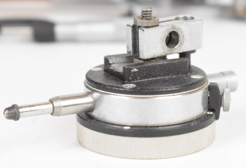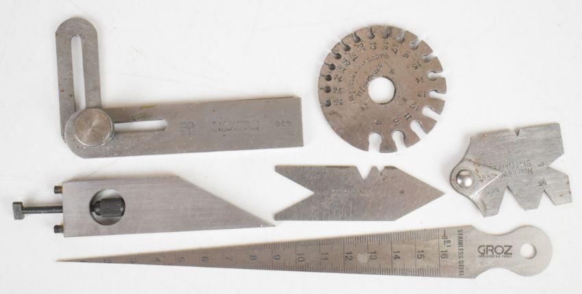 Engineering tools in mahogany box, to include John Bull dial test indicator on magnetic base, Mitutoyo 0-1 inch micrometer, feeler gauges, angle measurer and thread gauge
