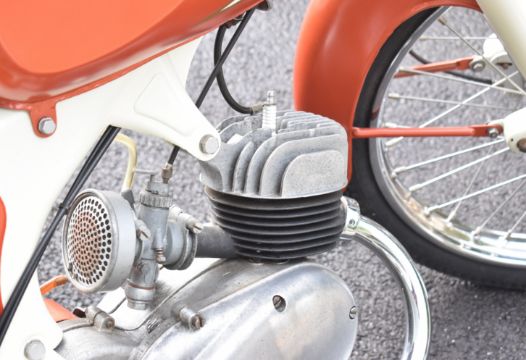 Circa 1956 Gimson 65cc 2 stroke Spanish motorcycle with two speed gearbox operated from the left hand twist grip, similar to a Vespa. Restored by the vendor, it has had new spokes and rims but otherwise is carefully restored, though he now confesses research has now revealed that the silencer should be painted black. It comes with the 1961 Spanish tax form it last wore. The vendor did run the bike after its restoration but of recent years its been mounted on his workshop wall.