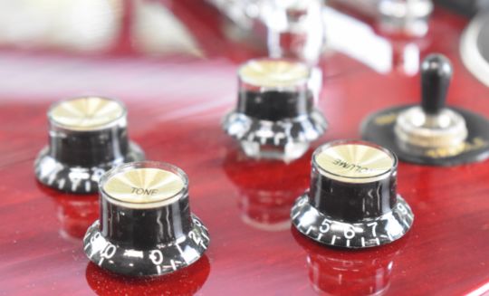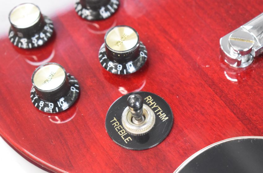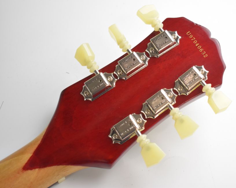Epiphone SG electric guitar in heritage cherry finish with rosewood fretboard, pearlescent inlays and humbucker pickups, made in Korea 1997, serial no. U97040632.