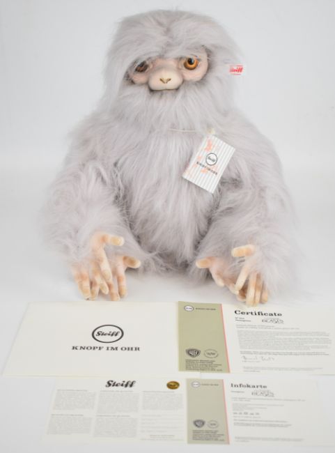 Steiff 'Demiguise' Fantastic Beasts and Harry Potter related plush animal with silver/grey mohair, jointed limbs, button to ear and original tags, limited edition 353/750 with certificate of authenticity, 354687, height 40cm.