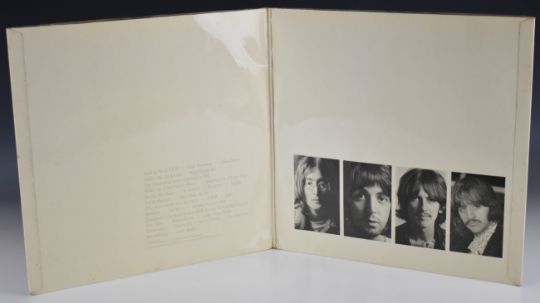 The Beatles 'White Album' (PCS 7067) with Beatles embossed on the front of the Garrod and Lofthouse top opening gatefold cover numbered 0536621 and small 'Stereo' printed top right on back. 'Sold in UK subject to etc' on labels and 'An EMI Recording' above 33 1/3 on all four labels. Black inner liners and all four (very clean) photos present. Vinyl appears to be VG+ or better in the main.